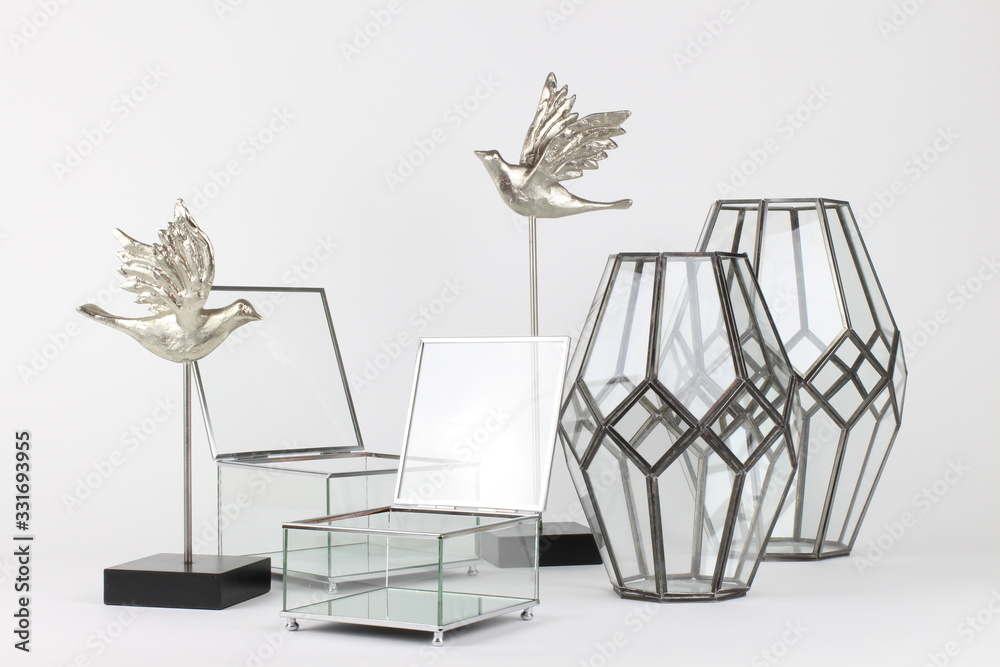 Silver Interior Decorative Objects Arrangement with white background