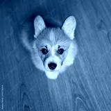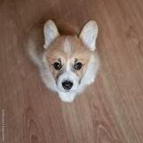 top view of the puppy the Corgi sits on the floor and stares devotedly at its owner