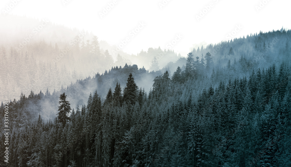 Green mountain forest in the fog. Evergreen spruce and pine trees on the slopes.