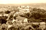 Chiusi Scalo houses in Tuscany, Italy town cityscape and red geranium flowers in garden foreground on building terrace patio landscape view