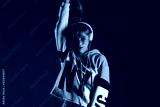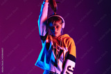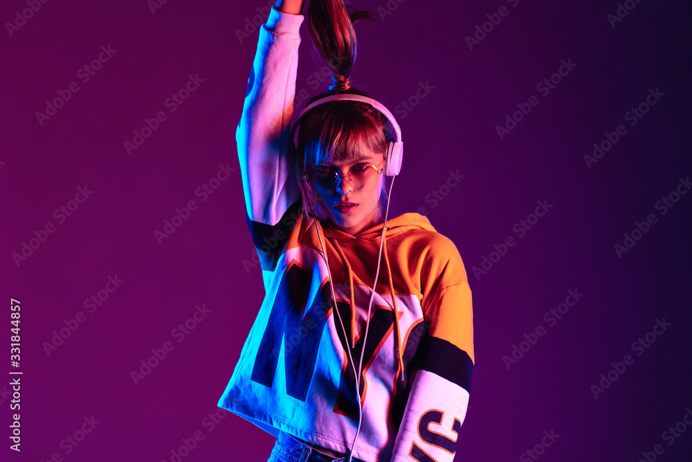 Stylish fashion igen teen hipster pretty girl model wear glasses headphones enjoy listen new trendy dance music mix look at camera hold ponytail stand at purple studio background 80s party, portrait