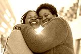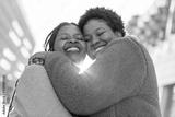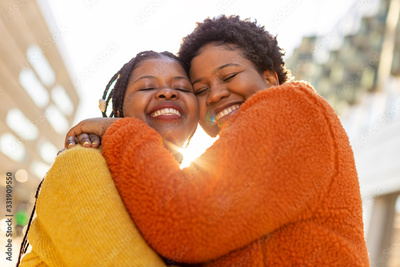 Portrait of two beautiful happy girlfriends embracing outdoors