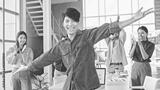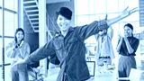 Happy Asian young man and creative colleague coworker woman, dance and clap together in modern office. Workplace party, teamwork group celebration, healthy lifestyle, positive business people concept
