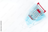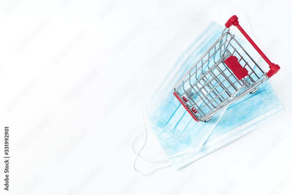 Medical mask in shop trolley on white background. Sale of medical masks. Coronavirus concept. 2019 nCoV.