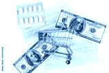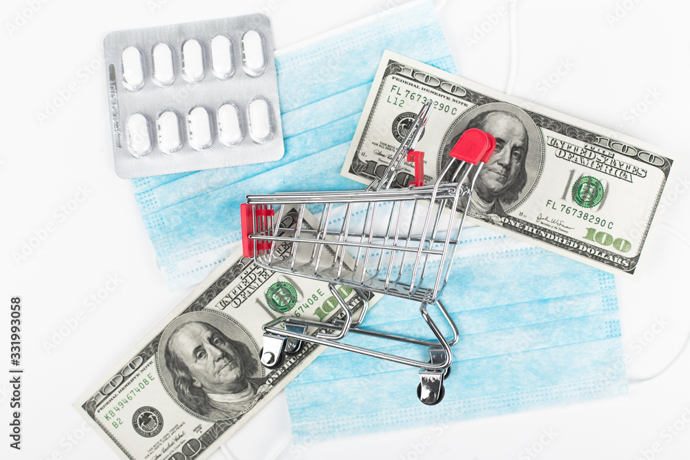 Sale of medical masks. Medical mask in shop trolley with money on white background. Coronavirus concept. 2019 nCoV.