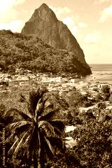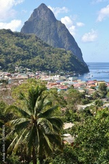 A view across the town of Soufriere towards the Pitons and the Caribbean Sea in St Lucia