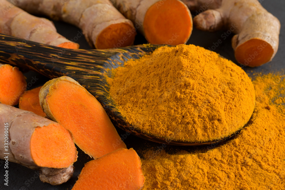 Turmeric powder and fresh turmeric (curcumin) on black background,Used for cooking and as herbal medicine,top view.