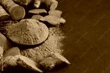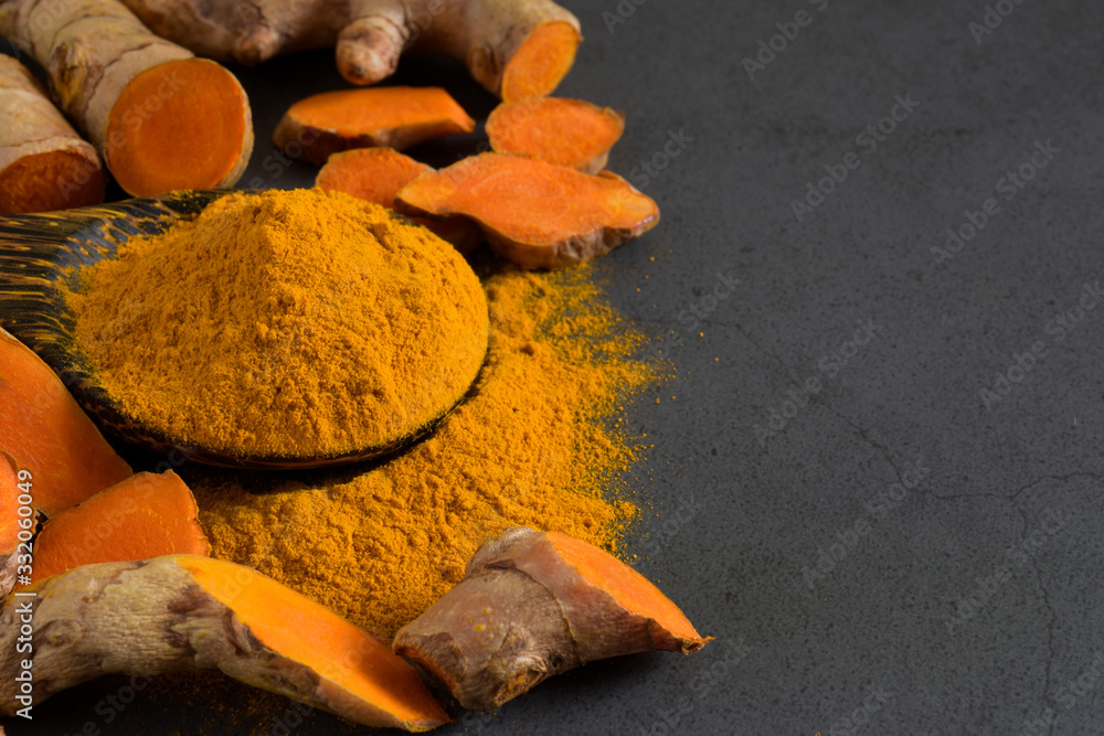 Turmeric powder and fresh turmeric (curcumin) on black background,Used for cooking and as herbal medicine,top view,copy space.