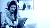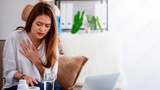 Asian beautiful woman sick with feeling pain in the chest while working with a laptop.Hand holding chest after taking a medication.Concept of hard work without maintaining health.