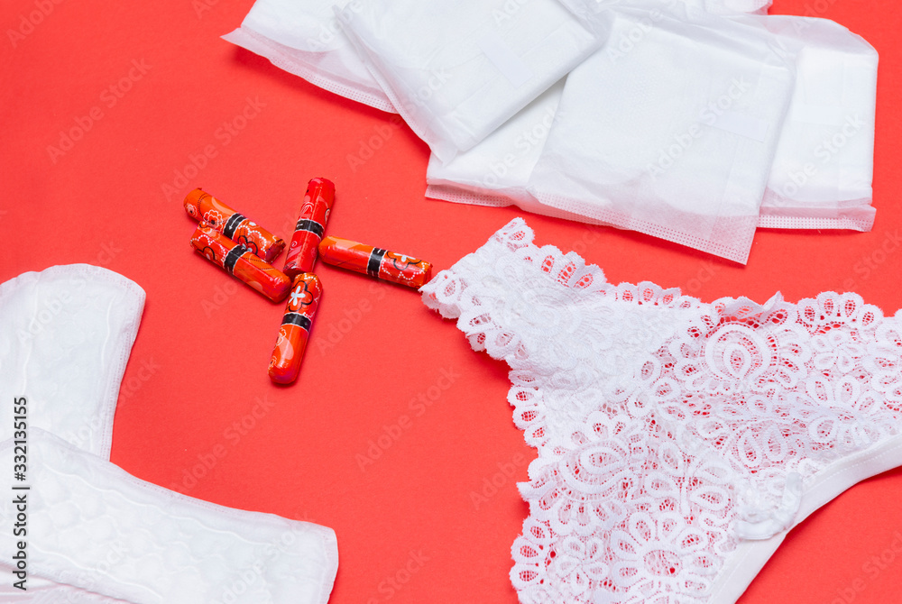 women sanitary pads, daily pads, tampons, women's white lace panties on on red background