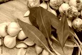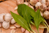 Wild garlic ramson or bear garlic with garlic bulb and garlic cloves on wooden cutting board
