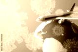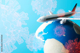 airplane travel of nCov covid-19 structure coronavirus crisis outbreak pandemic biohazard cell atom disease syndrome in wuhan china in background, healthy medical concept