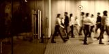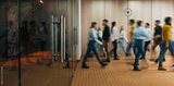 Group of office employees in motion go around at coworking space. People in business center walking at hall. Motion blur. Wide image
