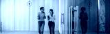 Two young coworkers meeting while they go around office hall. Group of young business people meet and discuss project on the go at coworking center