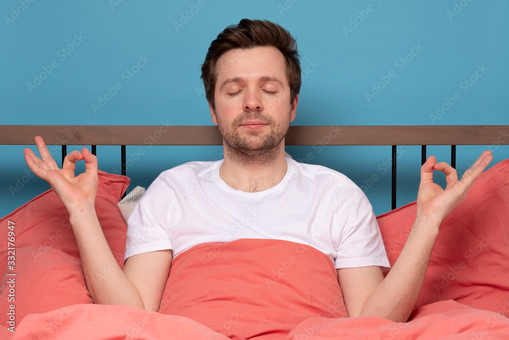 man meditates on quarantine, at the bed, tries to relax and does not panic