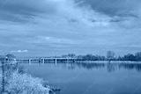 Brzeg rzeki porośnięty lasem w słoneczny dzień z chmurami na niebie, w tle most przez rzekę.