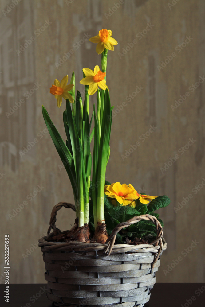 Yellow Narcissus (Narcíssus pseudonarcíssus). Composition of blossoming yellow daffodils and Primula (Primulaceae) in the wicker basket. Home still life. Early spring flowers