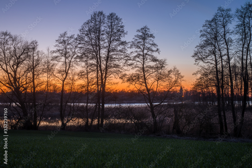 Colorful evening and sunset over a lake, winter in Masuria Lake District. Swamps overgrown with trees and reeds. Poland