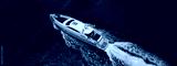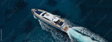 Aerial drone top down photo of luxury yacht with wooden deck anchored in open ocean sea