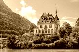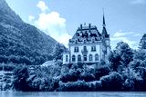 Schloss Seeburg. Seeburg castle was built on peninsula surrounded by the teal coloredwaters of lake Brienz. Iseltwald, Switzerland.