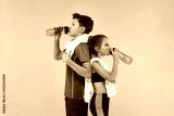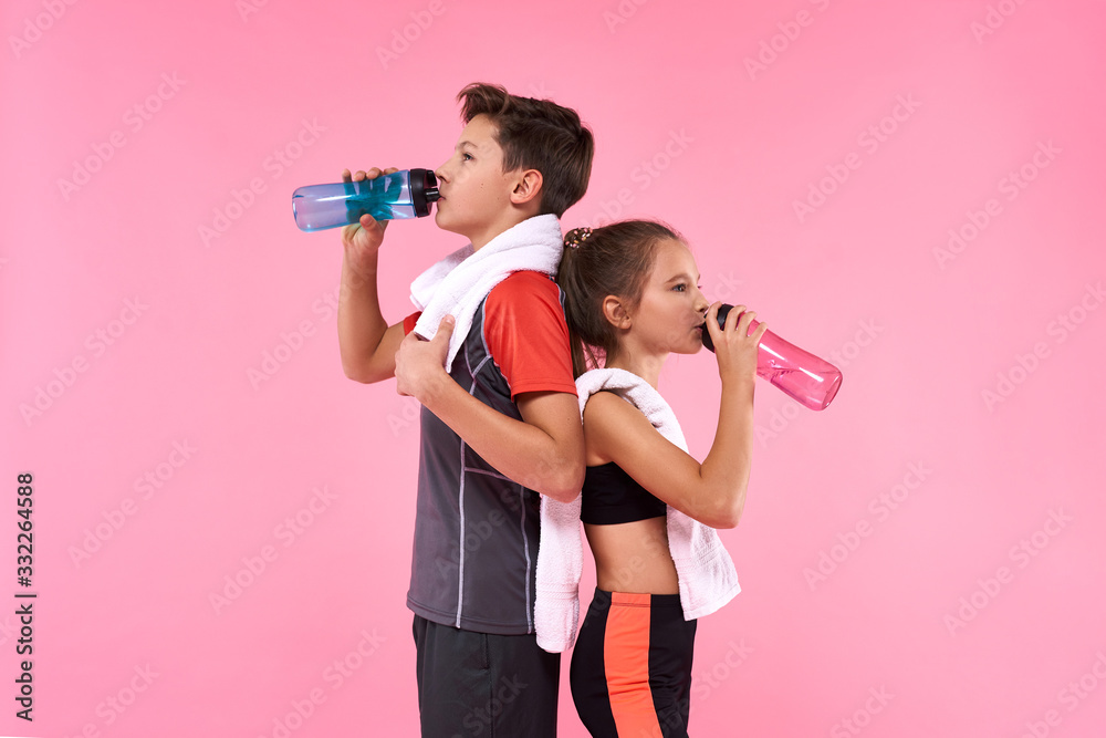 Every Sip Counts. Two teenagers boy and girl posing with towels and bottles of water after workout isolated on pink background. Fitness, sport, training, active lifestyle concept