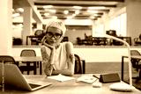 Creative job. Pretty and young tattooed business lady in eyewear looking at camera while working alone in the modern office