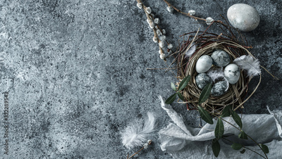 Marble Easter eggs in bird nest with feathers and spring flowers on blue background with napkin. Happy Easter holiday, top view, flat lay, wide composition