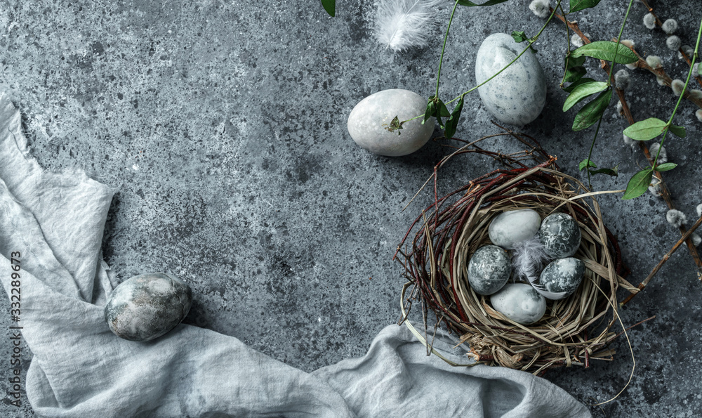 Marble Easter eggs in bird nest with feathers and spring flowers on blue background with napkin. Happy Easter holiday, top view, flat lay