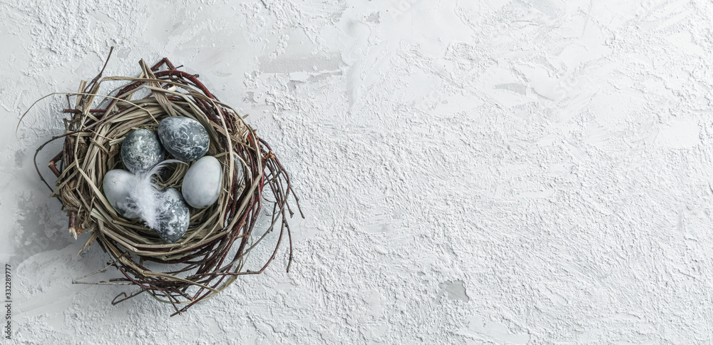 Easter eggs in bird nest with feather on white background with space for text. Happy Easter holiday, top view, flat lay, wide composition