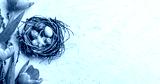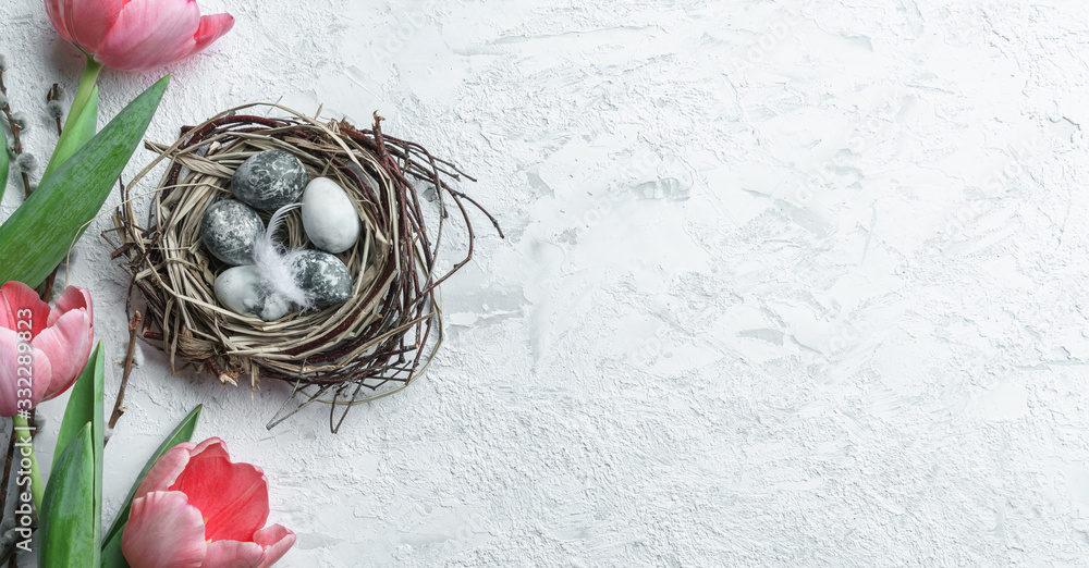 Easter eggs in nest with feather on white background with spring tulips flowers. Happy Easter holiday, top view, flat lay