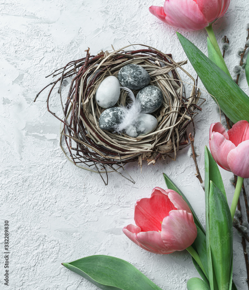 Easter eggs in nest with feather on white background with spring tulips flowers. Happy Easter holiday, top view, flat lay