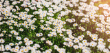 Chamomile field flowers or daisies flowers blooming in sunlight background. Summer flowers, selective focus