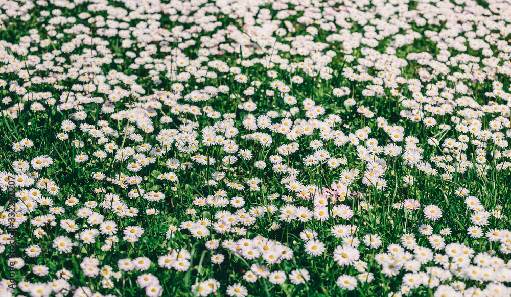 Chamomile field flowers or daisies flowers blooming in sunlight background. Summer flowers, selective focus