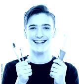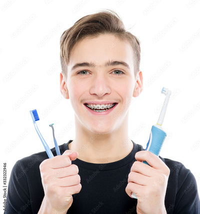 Teenager holds a toothbrush and brush for braces care while looking at the camera. Dental care concept. Smiling young man cares for his teeth - isolated on a white background.