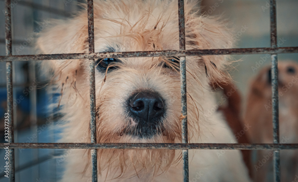 Sad dog in shelter waiting to be rescued and adopted to new home. Shelter for animals concept