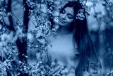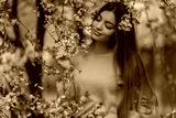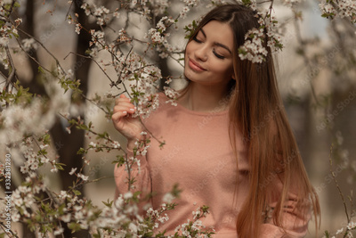 Portrait of pretty young girl in the garden of blossom cherry trees. Spring time