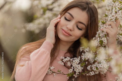 Portrait of pretty young girl in the garden of blossom cherry trees. Spring time