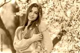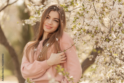 Portrait of pretty young girl in the garden of blossom cherry trees. Spring time