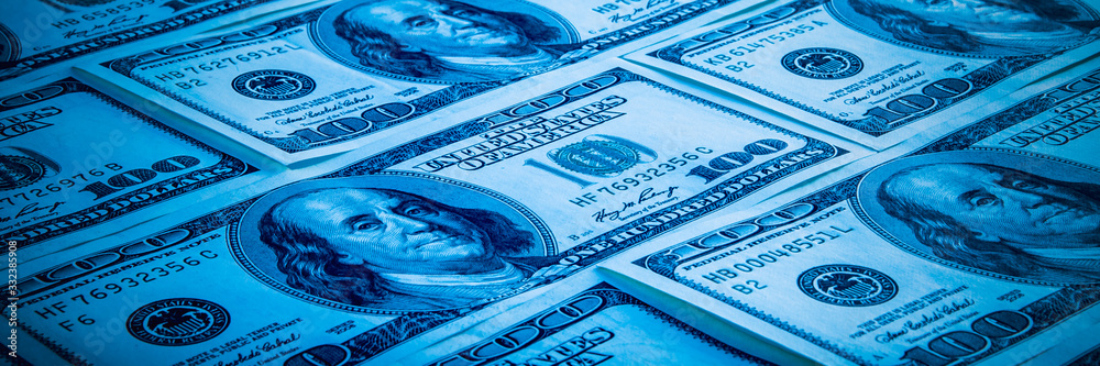 The background of a one hundred dollar bill. Style blue light.