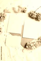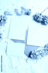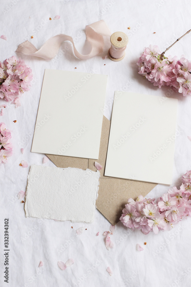 Wedding stationery mock-up scene. Blank greeting cards, envelope on linen tablecloth background with pink blossoming cherry tree branches and ribbon. Feminine still life composition. Flat lay,vertical
