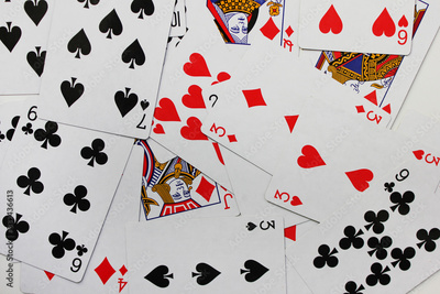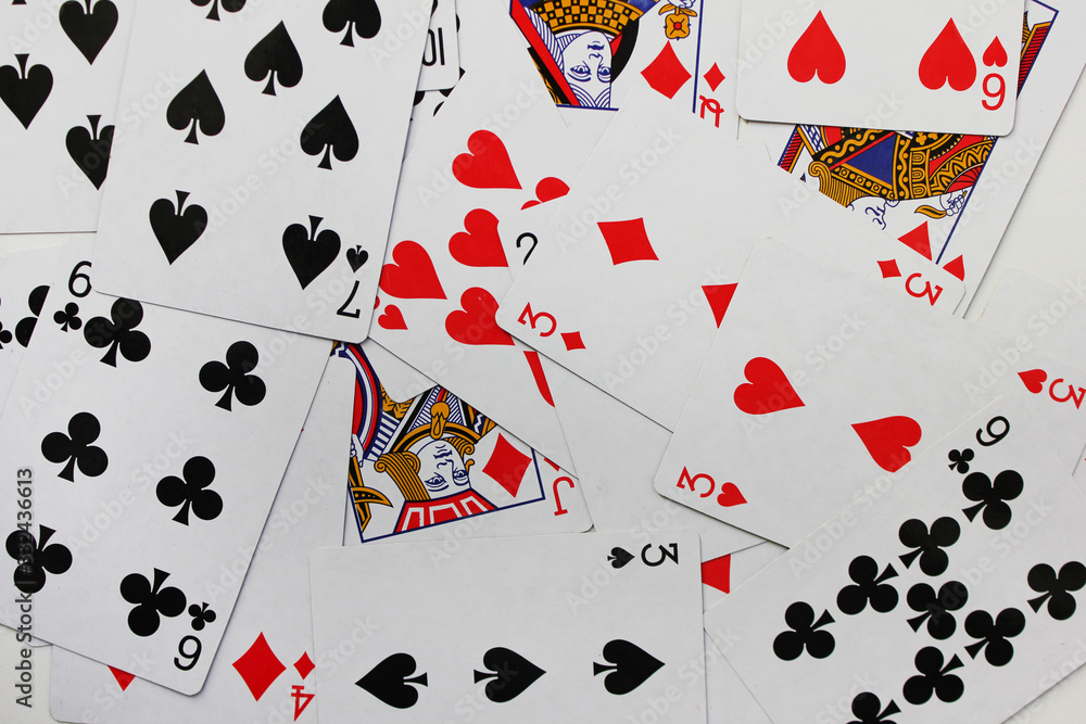 Playing cards background, many colorful cards in pile. Poker and blackjack game set, playing card deck with spades, hearts, diamonds and clubs symbols close up top view