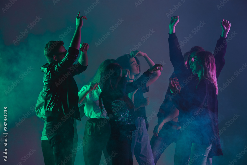 Cheering dance party, performance concept. Crowd shadow of people dancing with neon colorful lights raised hands up on dark background. Celebration, holiday, weekend, nightlife and positive vibes.