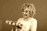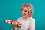 Grandmother model on a green background. Grandmother in a white blouse smiles and looks at sushi. Happy grandmother. Fashion, beauty, model, studio concept