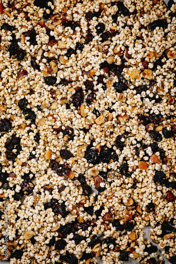 Homemade puffed millet grain granola with dried fruits and nuts as healthy food background. Flat lay, close up