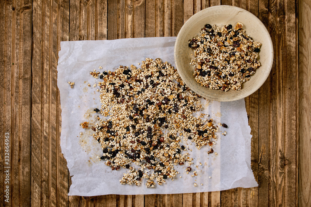 Homemade crunchy puffed millet grain granola with dried fruits and nuts on baking paper over wooden plank background. Flat lay, space. Healthy food breakfast