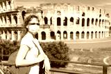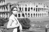 COVID-19 coronavirus in Italy, woman in face medical mask next to empty Colosseum in Rome. Tourist landmarks closed due to corona virus outbreak.
