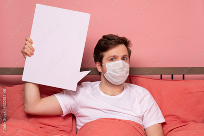 Caucasian young man in medical mask lying down in bed having flu holding copyspace