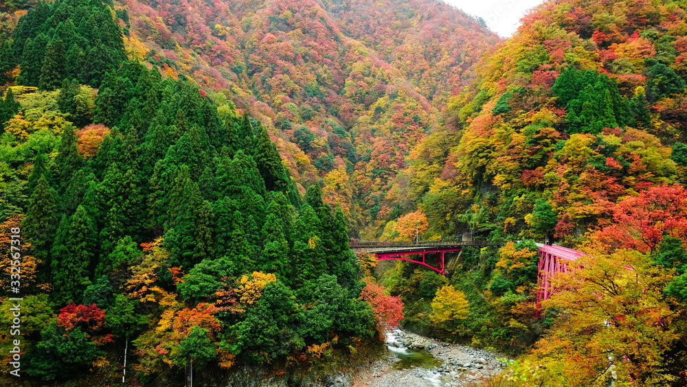 Beautiful view of yamabiko red bridges and mountain river to travel in the train to Kurobe gorge during the Autumn Season, Toyama, Japan ,Leaves color change.