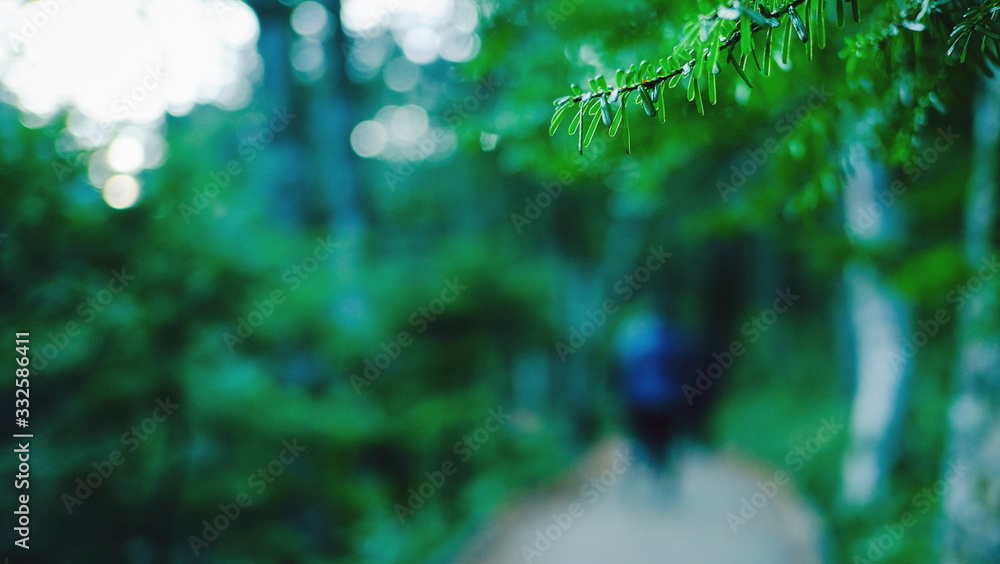 Selective focus of green leaves in the forest with blurred traveler hiking on pathway background.