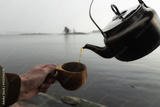 Man pours hot tea from a camp kettle into a wooden cup. Sea and islands on background.